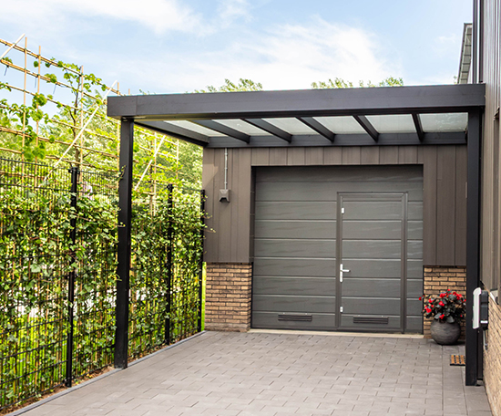 Deze aluminium carport met glazen dak biedt niet alleen bescherming voor het voertuig, maar tilt ook de uitstraling van de woning naar een hoger niveau.