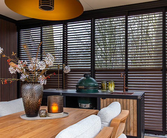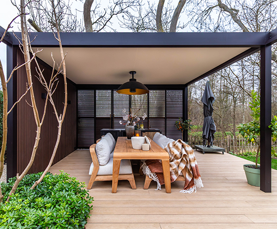 Lamellen panelen vormen een stijlvolle toevoeging aan de overkapping en bieden tegelijkertijd zonwering, windbeschutting en extra privacy.