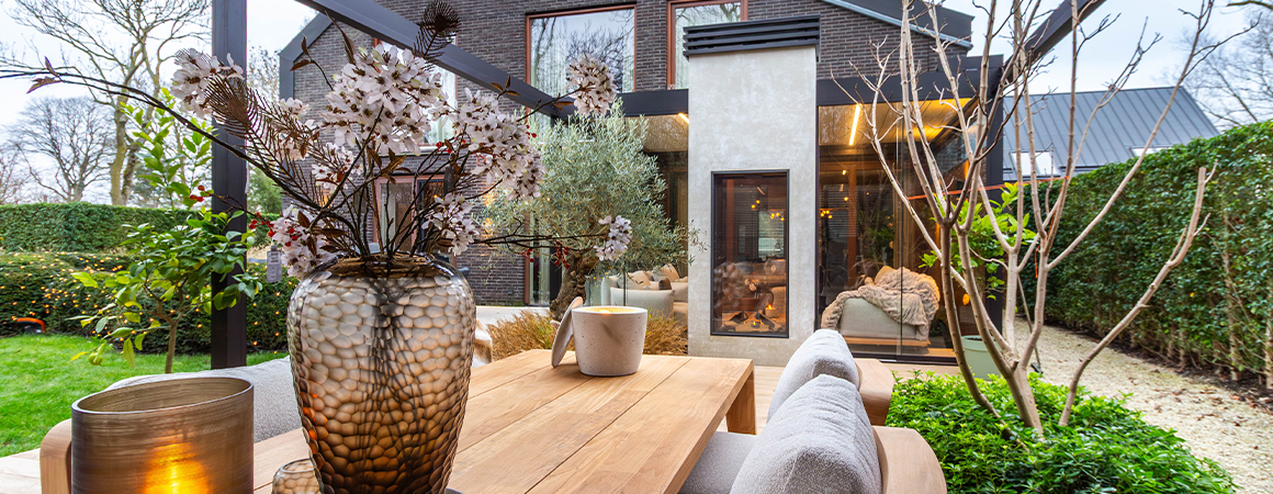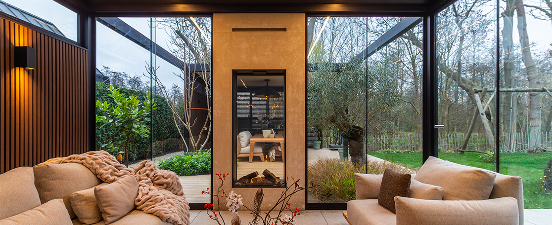 De doorkijkhaard vormt het warme hart van deze Renson Algarve overkapping met lamellendak. Zo ontstaat een sfeervolle, functionele buitenkamer die uitnodigt tot lange avonden vol comfort en beleving.