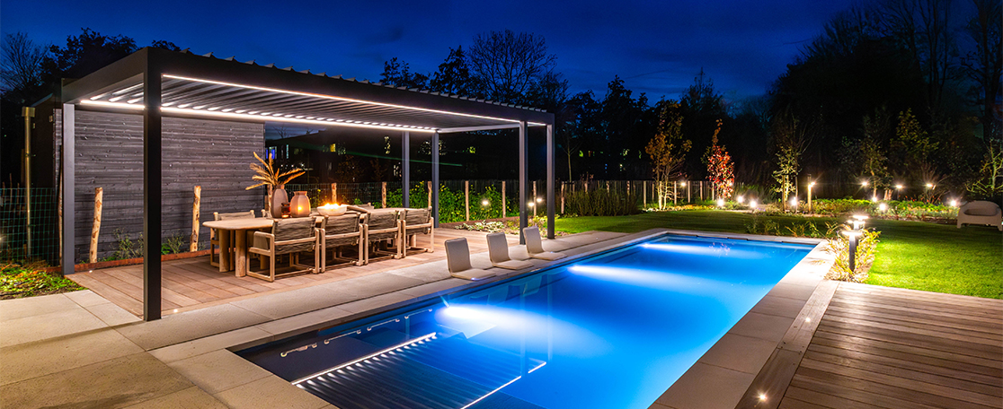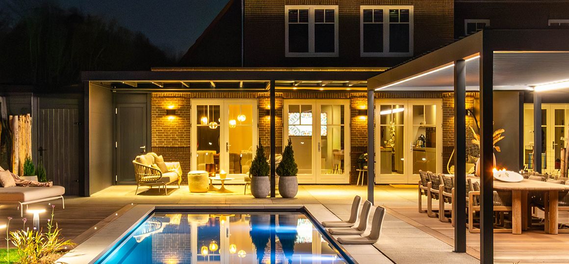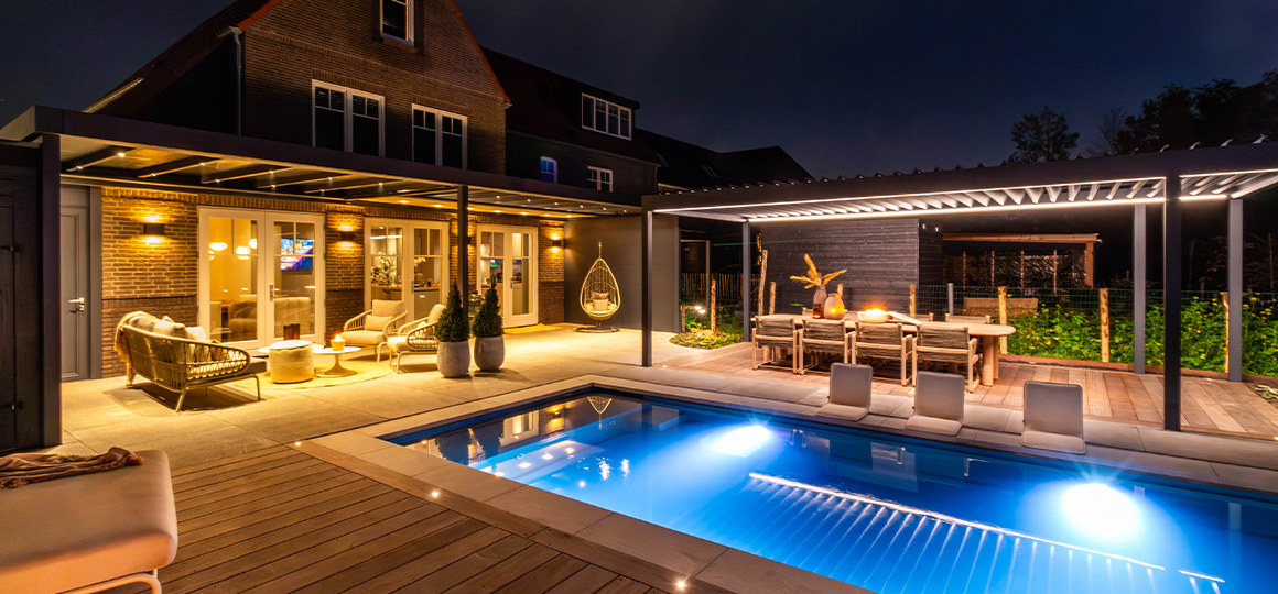 In dit high-end tuinproject komen alle elementen van luxe buitenleven samen: een verfrissende duik in het water, dineren onder de overkapping en ontspannen loungen in een stijlvolle setting. Een buitenruimte waarin ontspanning en comfort centraal staan.