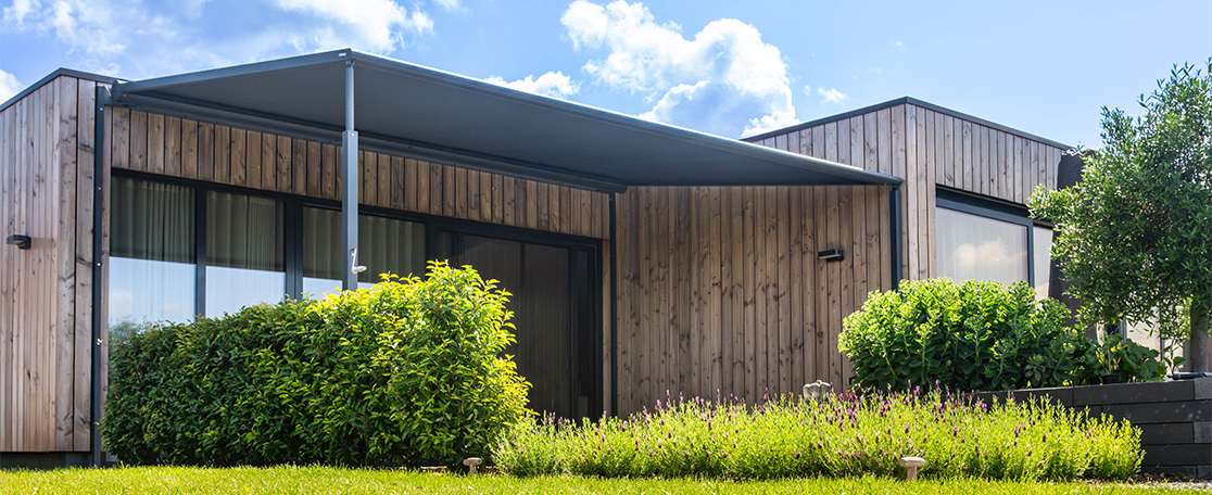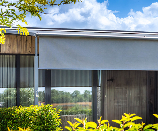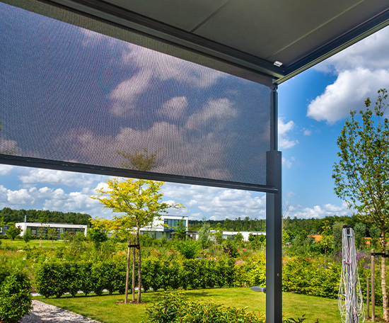 De zonwering met staanders is uit te breiden met een uitrolbare volant. Deze verticale zonwering biedt privacy en bescherming voor laagstaande zon. Tevens houdt het de warmte onder de zonwering vast.
